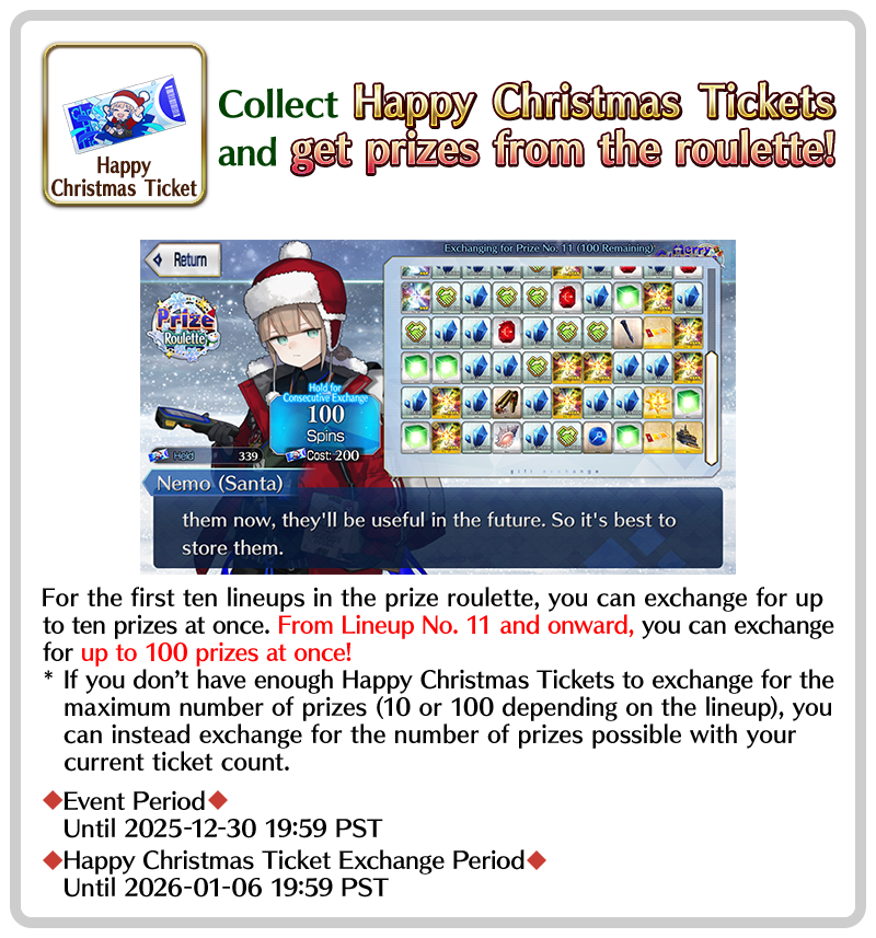 During the ongoing Limited Time Event, you can use Happy Christmas Tickets to spin a prize roulette!
