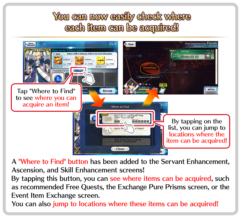 A "Where to Find" button has been added to the Servant Enhancement, Ascension, and Skill Enhancement screens!