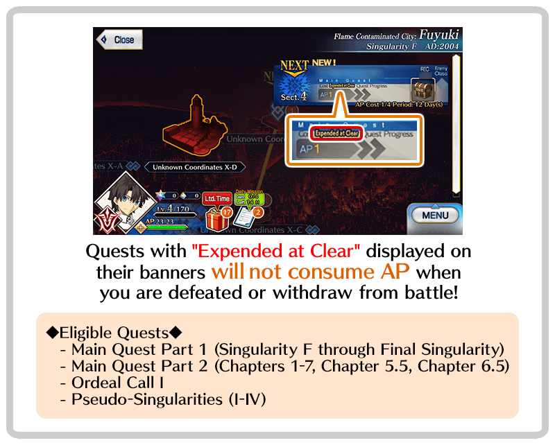 From 2025-12-19, Main Quests with "Expended at Clear" displayed will not consume AP when you are defeated or withdraw in battle. * Some quests will have "Withdraw Cost 0" displayed, but the amount of AP consumed upon clear won't change.