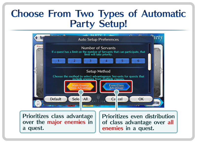 The "Setup Method" option in "Auto Setup Preferences" lets you choose between "Main Enemy Class Advantage" and "Even Class Advantage". This determines how auto setup prioritizes class advantage over enemies in a quest.