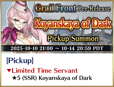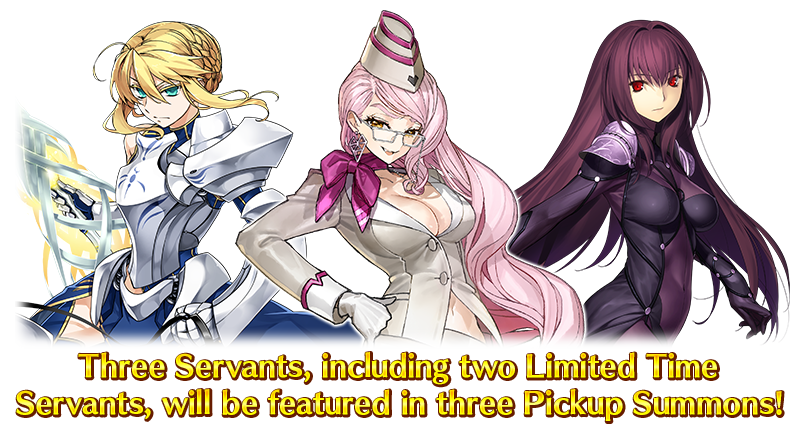 To go along with the "'Grail Front - Castle of Shining Dawn, Castle of Shadowed Dusk' Pre-Release Campaign", three Servants, including two Limited Time Servants, will be available for Pickup in three Pickup Summons!