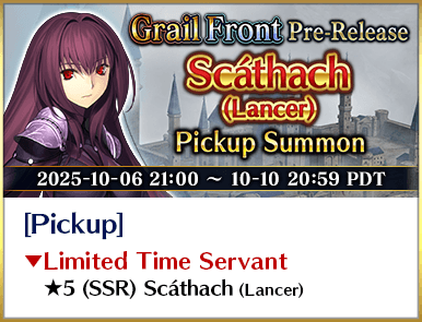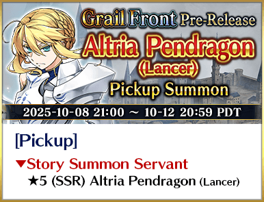 * The following Limited Time Servant(s) will only be summonable from the Summon Lineup(s) where they are featured as a Pickup Servant. In addition, they will not be added to Story Summon after the Pickup Summon period ends.