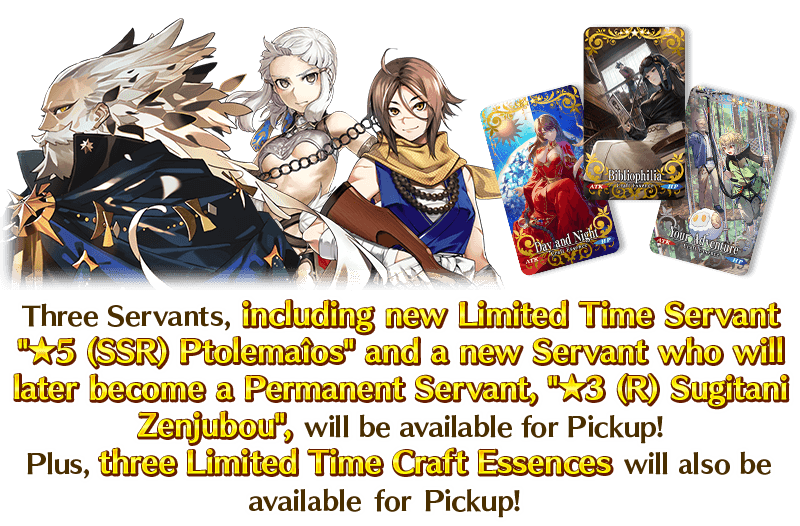 About Featured Servants: * The illustration for the changed Noble Phantasm Card for ★5 (SSR) Ptolemaîos will be partially hidden until a specific Ascension stage is achieved. * The following Limited Time Servant(s) will not be added to Story Summon after the Pickup Summon period ends. - ★5 (SSR) Ptolemaîos * The following Servant(s) will continue to be available through Story Summon after the Pickup Summon period ends. - ★4 (SR) Penthesilea (Berserker of El Dorado) * The following Servant(s) will be added to Story Summon and Friend Point Summon after the Pickup Summon period ends. - ★3 (R) Sugitani Zenjubou * The name displayed for Servants whose True Names are hidden will change based on story progression. In some cases, the name displayed for their Noble Phantasm will also change. * Servants added to Story Summon through story progression will not be summonable. Please be sure to confirm the lineup before summoning.