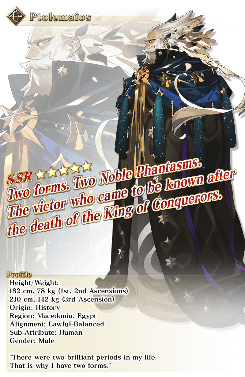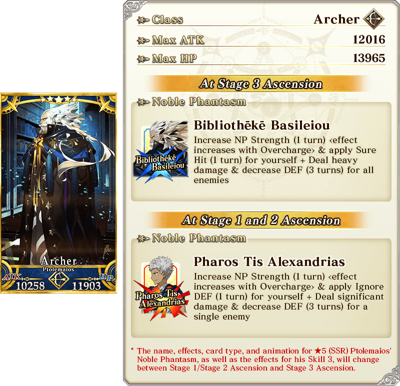 * ★5 (SSR) Ptolemaîos' Noble Phantasm only targets a single enemy at Stage 1 and Stage 2 Ascension, but it targets all enemies at Stage 3 Ascension. Also, the effects for his Skill 3 change between Stage 1/Stage 2 Ascension and Stage 3 Ascension.