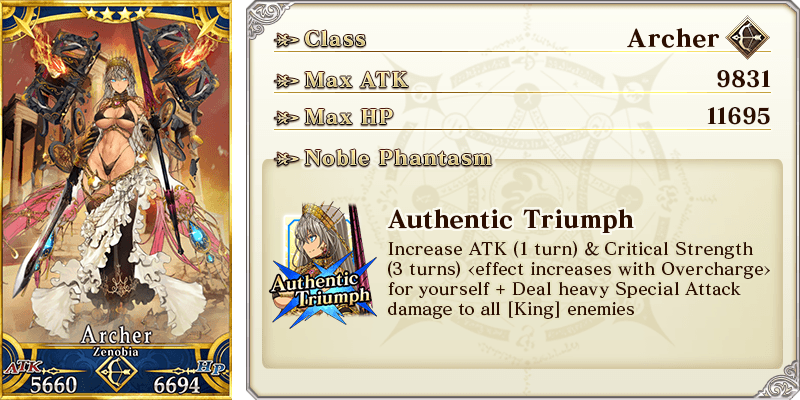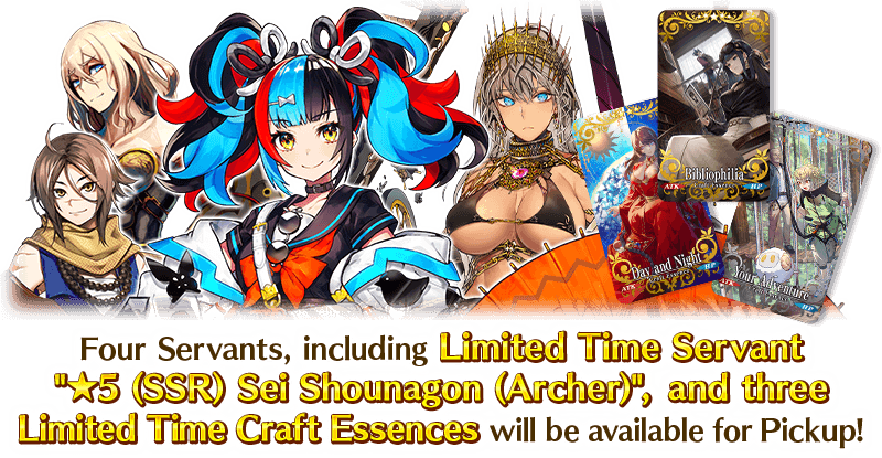 About Featured Servants: * Please note that the following Servant(s) available for Pickup in this Pickup Summon will not receive an ATK Strength bonus or a Bond Points Gained bonus within the Limited Time Event "Grail Front - Castle of Shining Dawn, Castle of Shadowed Dusk". - ★5 (SSR) Sei Shounagon (Archer) - ★4 (SR) Zenobia * The following Limited Time Servant(s) will not be added to Story Summon after the Pickup Summon period ends. - ★5 (SSR) Sei Shounagon (Archer) * The following Servant(s) will continue to be available through Story Summon after the Pickup Summon period ends. - ★4 (SR) Zenobia * The following Servant(s) will be added to Story Summon and Friend Point Summon after the Pickup Summon period ends. - ★3 (R) Thēseus - ★3 (R) Sugitani Zenjubou * Servants added to Story Summon through story progression will not be summonable. Please be sure to confirm the lineup before summoning.