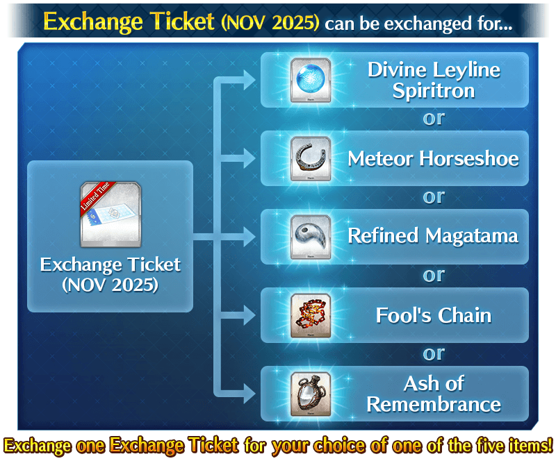 The "Exchange Ticket (NOV 2025)" available as a daily login bonus and daily mission rewards will be exchangeable for the following items.