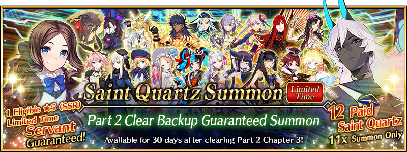 We've added a new "Part 2 Clear Backup Guaranteed Summon", which guarantees one Limited Time ★5 (SSR) Servant from those added to the game between August 2020 and July 2022 and will be available for all Masters who have cleared Part 2 Chapter 3.
