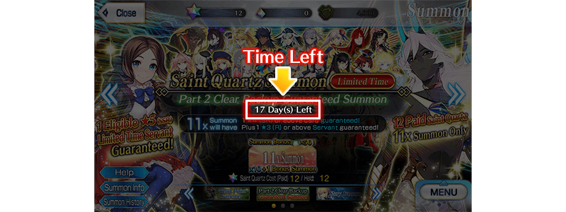 * You can check the time remaining until the "Part 2 Clear Backup Guaranteed Summon" disappears on the Saint Quartz Summon screen, as shown below.