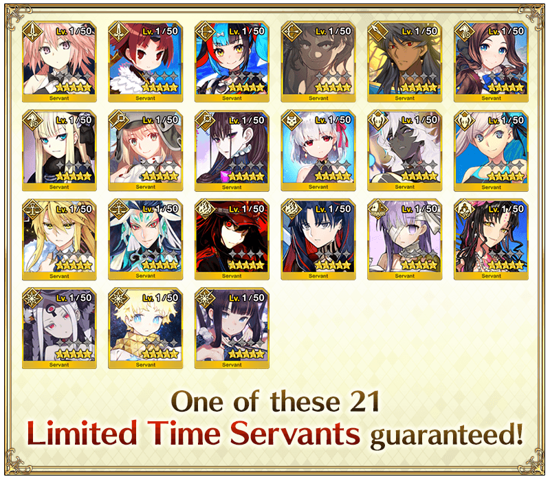 One Limited Time ★5 (SSR) Servant, one ★4 (SR) or above card, and one ★3 (R) or above Servant are guaranteed! * The guaranteed ★4 (SR) or above card can be either a Servant or a Craft Essence. * The distribution rate for the guaranteed ★3 (R) or above Servant will differ from that listed on the "Summon Info" screen. * In-game graphics may vary from the images used within this article.