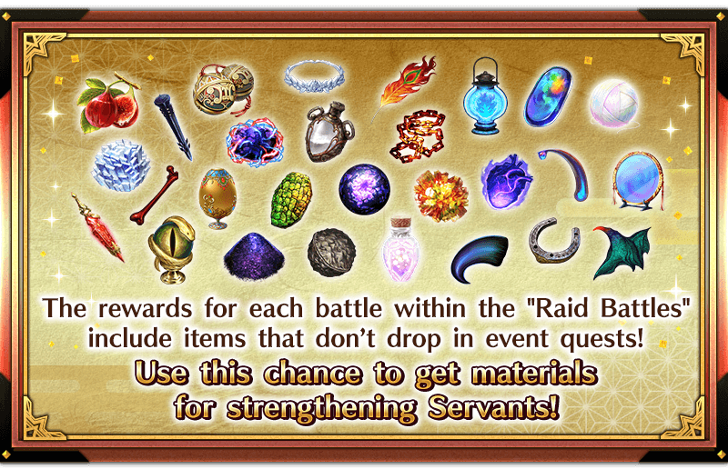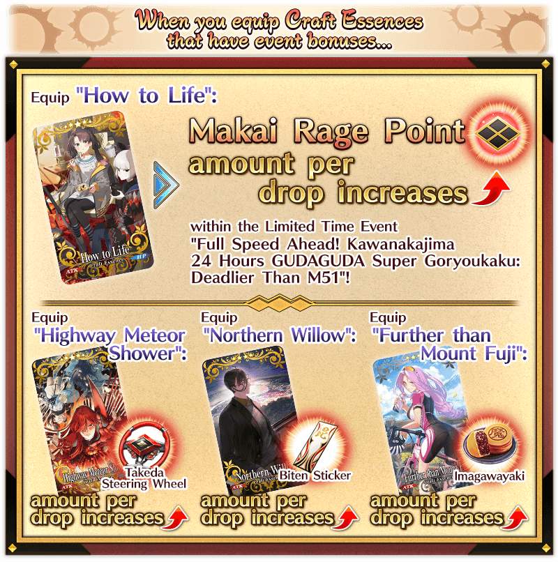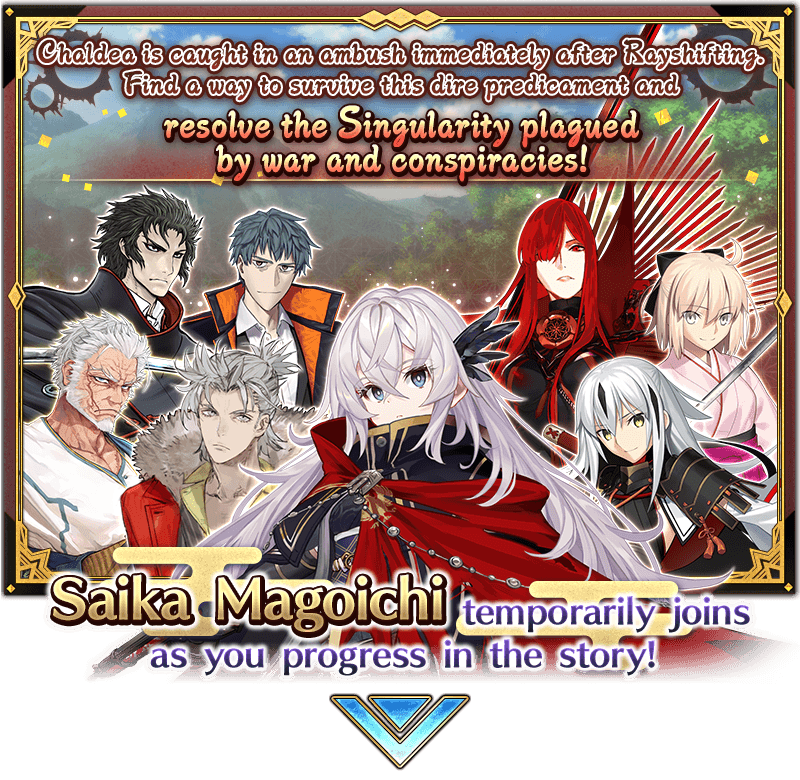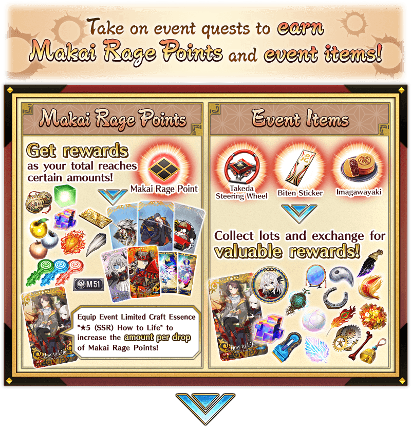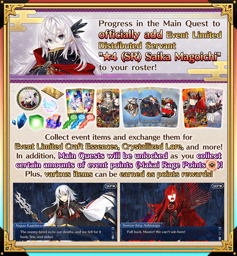 * Crystallized Lore, Hero Crystal: Meteor Fou ALL ★4 (HP), and Hero Crystal: Corona Fou ALL ★4 (ATK) will become available for exchange after you clear a section of the event Main Quest that will be unlocked at a later date. * Spirit Origins for Noble Phantasm Enhancement for ★4 (SR) Saika Magoichi will become available for exchange after you clear a certain Main Quest in this event. * Servant Coins for ★4 (SR) Saika Magoichi will become available for exchange once she officially joins your roster. * The following items will disappear at the end of the exchange period: Takeda Steering Wheel, Biten Sticker, and Imagawayaki.