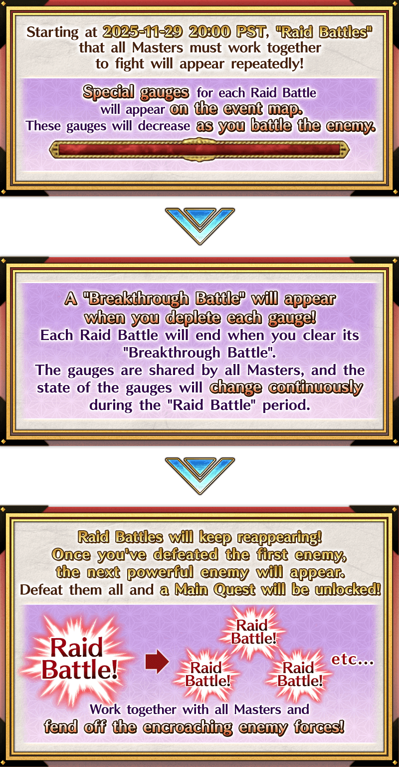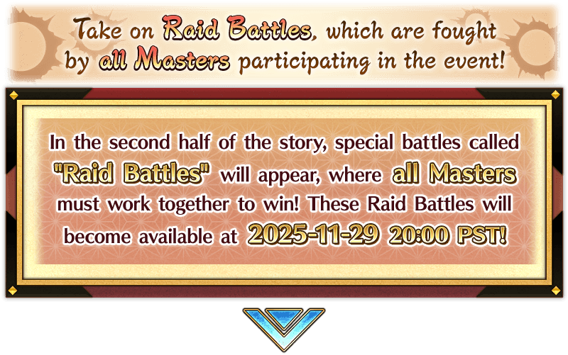 As you progress through the Main Quest, special "Raid Battles", where you must fight with all other Masters participating in the event, will appear.