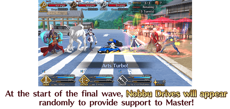 In this event, "Nobbu Drives" will appear at the start of the final wave in some quests, including Free Quests, to grant various buffs and give additional rewards!