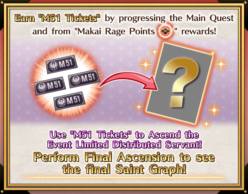 Use M51 Tickets, available through Main Quest progress and as Makai Rage Points rewards during the event, to perform Ascension four times and see the final Saint Graph!