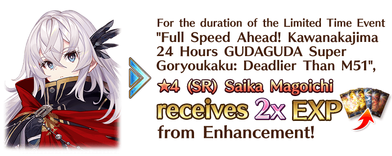 For the duration of the event period, Event Limited Distributed Servant "★4 (SR) Saika Magoichi" will receive double EXP when performing Enhancement.