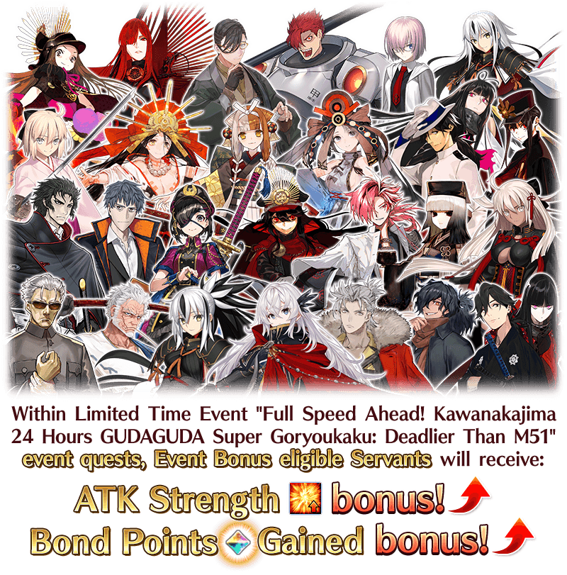 - Clear all Bonus Quests in the Limited Time Event "Full Speed Ahead! Kawanakajima 24 Hours GUDAGUDA Super Goryoukaku: Deadlier Than M51"