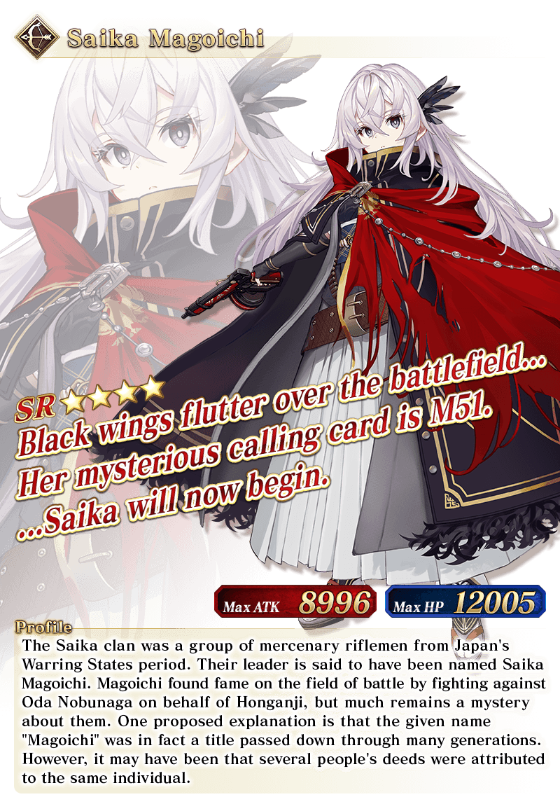 * The battle sprite for ★4 (SR) Saika Magoichi will not change with Ascension.