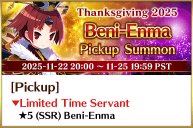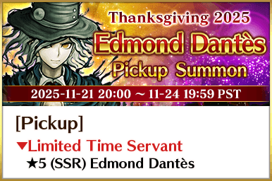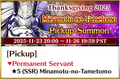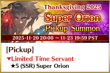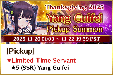 To commemorate "The FGO Thanksgiving Special 2025", five Servants, including four Limited Time Servants, will be featured in five Pickup Summons!