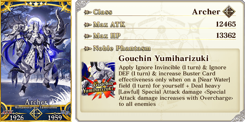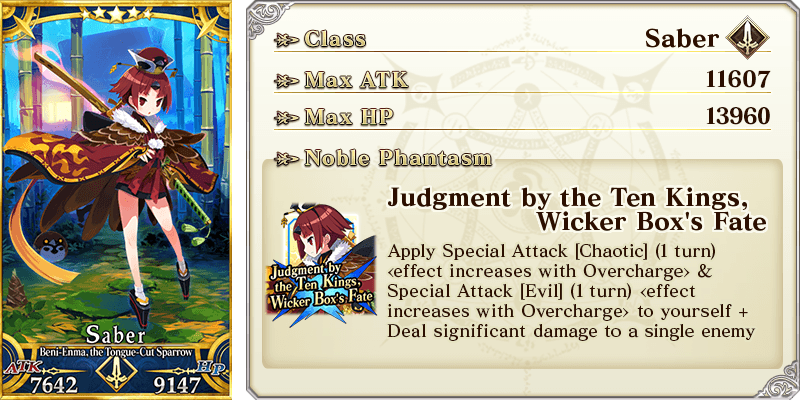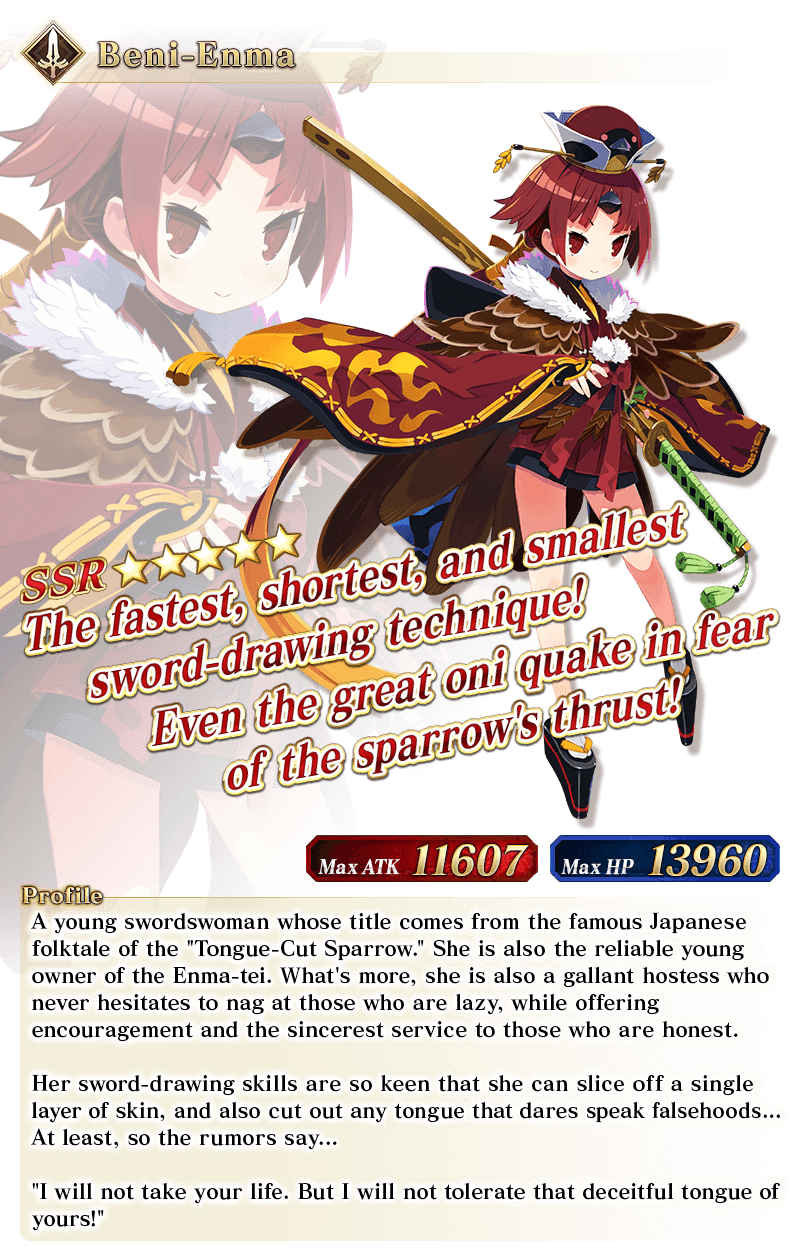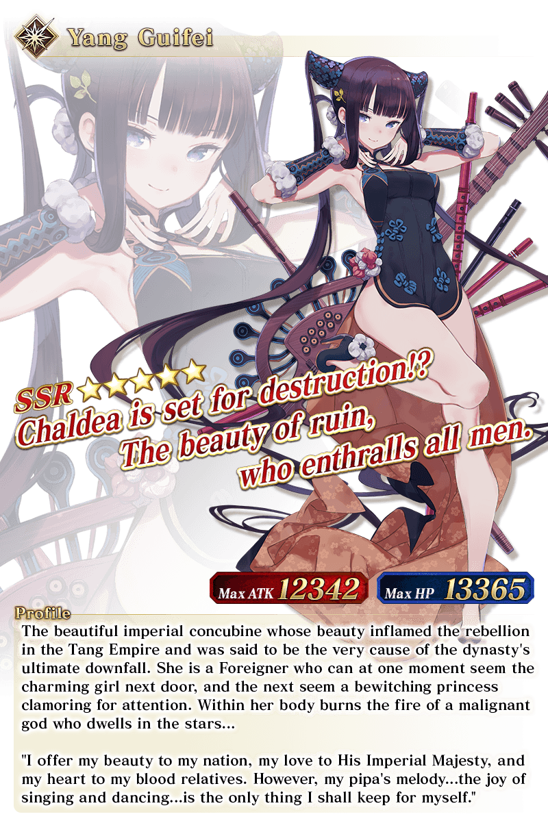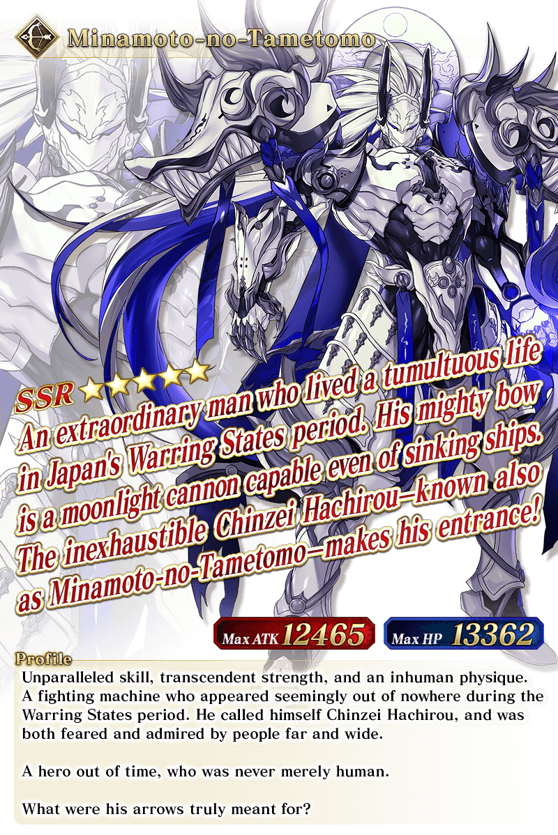 About Featured Servants: * The following Limited Time Servant(s) will only be summonable from the Summon Lineup(s) where they are featured as a Pickup Servant. In addition, they will not be added to Story Summon after the Pickup Summon period ends. - ★5 (SSR) Beni-Enma - ★5 (SSR) Super Orion - ★5 (SSR) Edmond Dantès - ★5 (SSR) Yang Guifei * The following Servant(s) will continue to be available through Story Summon after the Pickup Summon period ends. - ★5 (SSR) Minamoto-no-Tametomo * Servants added to Story Summon through story progression will not be summonable. Please be sure to confirm the lineup before summoning.