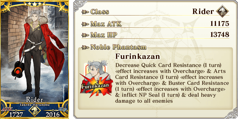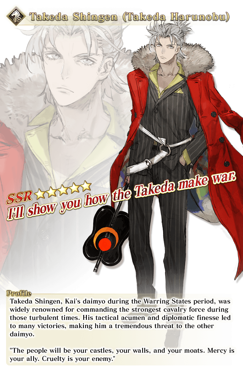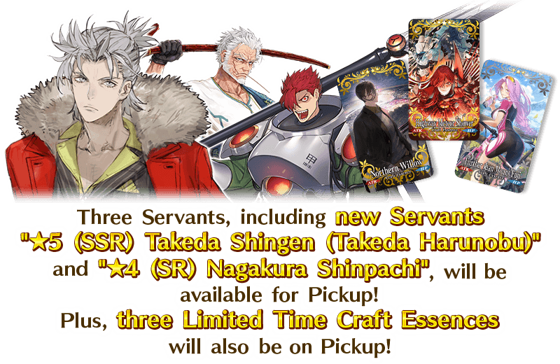 About Featured Servants: * The name displayed for ★5 (SSR) Takeda Shingen (Takeda Harunobu) will change from "★5 (SSR) Takeda Harunobu" to "★5 (SSR) Takeda Shingen" with Stage 3 Ascension. * The following Limited Time Servant(s) will not be added to Story Summon after the Pickup Summon period ends. - ★5 (SSR) Takeda Shingen (Takeda Harunobu) - ★4 (SR) Nagakura Shinpachi - ★3 (R) Mori Nagayoshi * Please note that the following Servant(s) will not be available through Friend Point Summon. - ★3 (R) Mori Nagayoshi * Servants added to Story Summon through story progression will not be summonable. Please be sure to confirm the lineup before summoning.