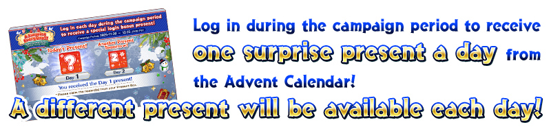* The first present will be distributed starting from 2025-11-30 20:00 PST (GMT -8). * One present will be distributed each day from 20:00 PST (GMT -8). * In the event that maintenance is conducted during the campaign period, that day's present will be distributed starting at the end of the maintenance period. * A different present will be distributed each day. You will not be able to receive a specific day's present if you do not log in that day. * You will still be able to receive further presents even if your login streak is broken. * It may not be possible to receive all presents depending on when you first start playing the game.