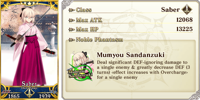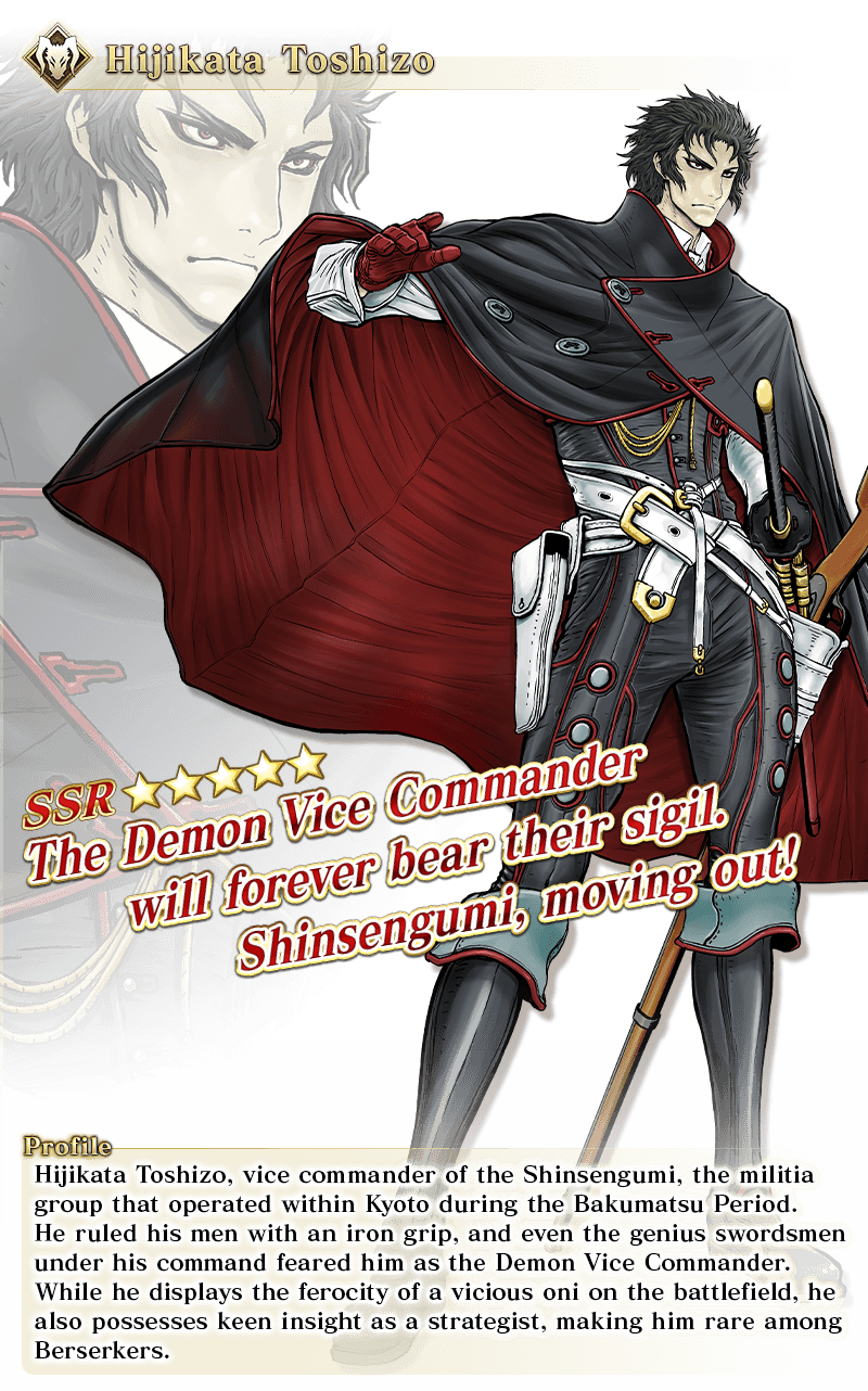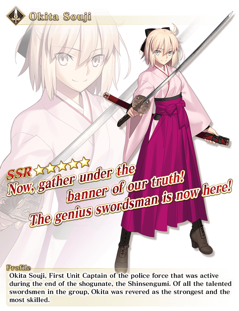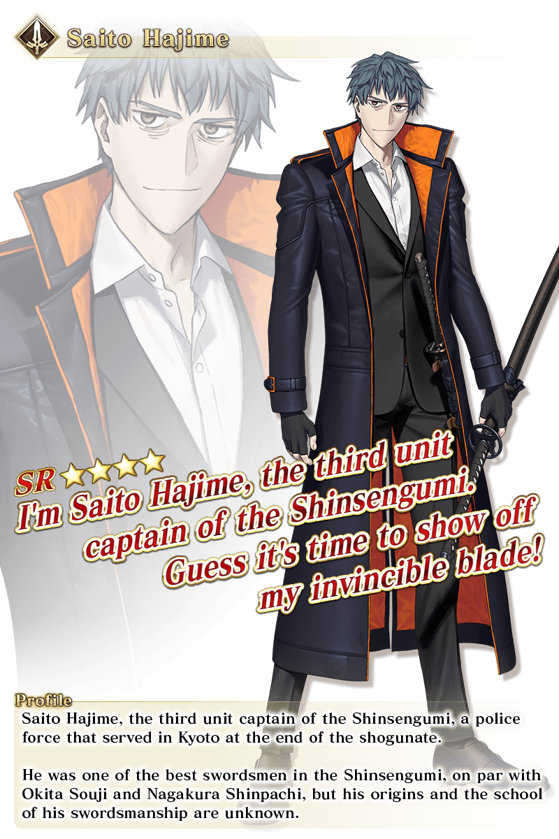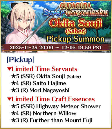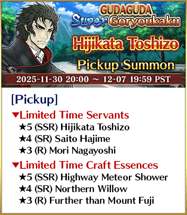 About Featured Servants: * The following Limited Time Servant(s) will only be summonable from the Summon Lineup(s) where they are featured as a Pickup Servant. In addition, they will not be added to Story Summon after the Pickup Summon period ends. - ★5 (SSR) Okita Souji (Saber) - ★5 (SSR) Hijikata Toshizo - ★4 (SR) Saito Hajime - ★3 (R) Mori Nagayoshi * Please note that the following Servant(s) will not be available through Friend Point Summon. - ★3 (R) Mori Nagayoshi * Servants added to Story Summon through story progression will not be summonable. Please be sure to confirm the lineup before summoning.