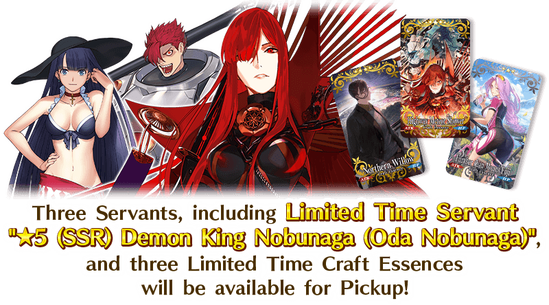 To aid in clearing Free Quests within the Limited Time Event "Full Speed Ahead! Kawanakajima 24 Hours GUDAGUDA Super Goryoukaku: Deadlier Than M51", three Servants, including Limited Time Servant "★5 (SSR) Demon King Nobunaga (Oda Nobunaga)", as well as three Limited Time Craft Essences will be featured in this Pickup Summon!