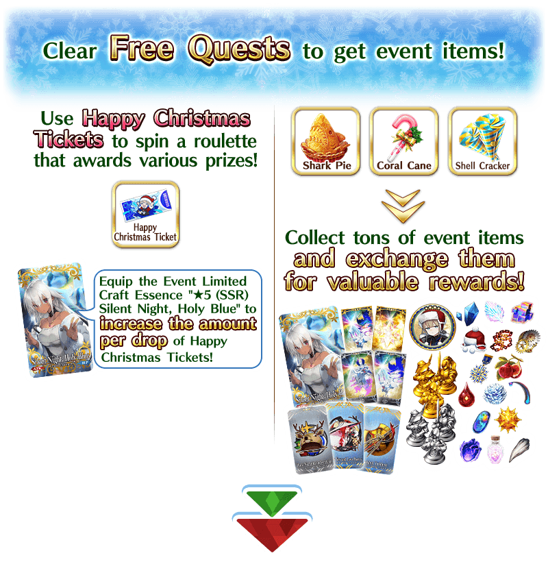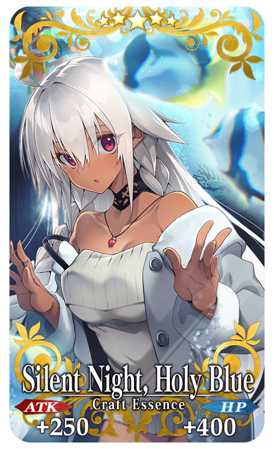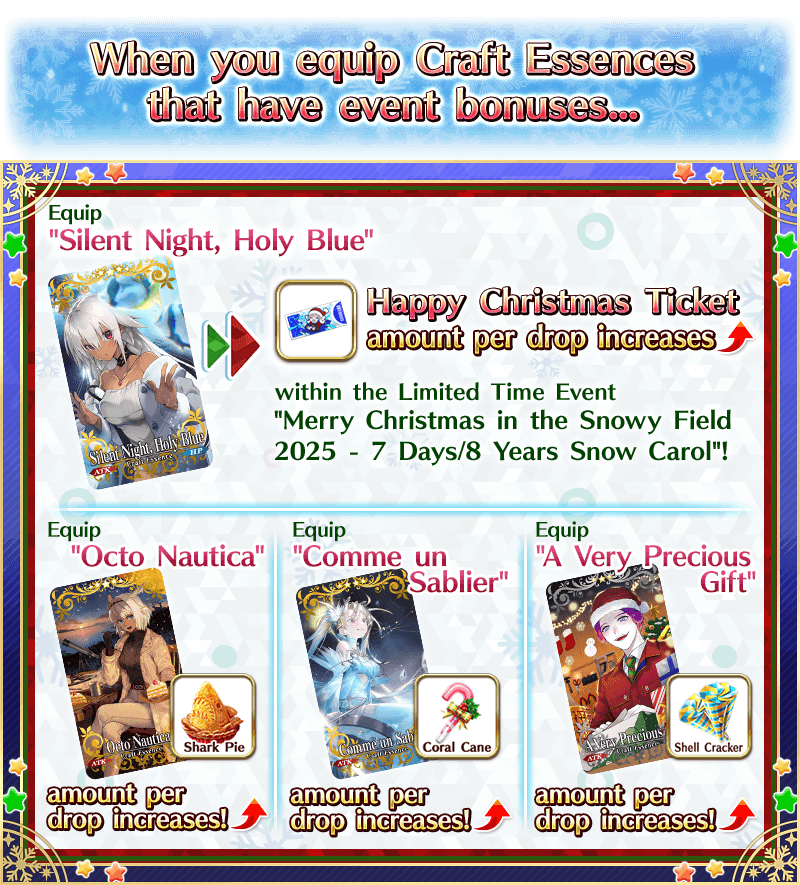 The Event Limited Craft Essence "★5 (SSR) Silent Night, Holy Blue" will grant a bonus to the amount per drop of Happy Christmas Tickets.
