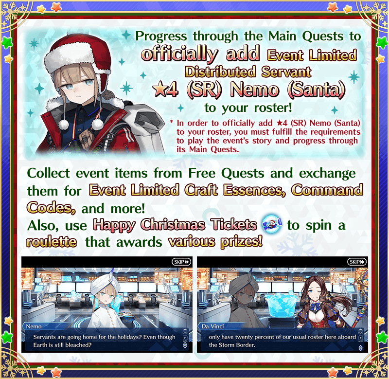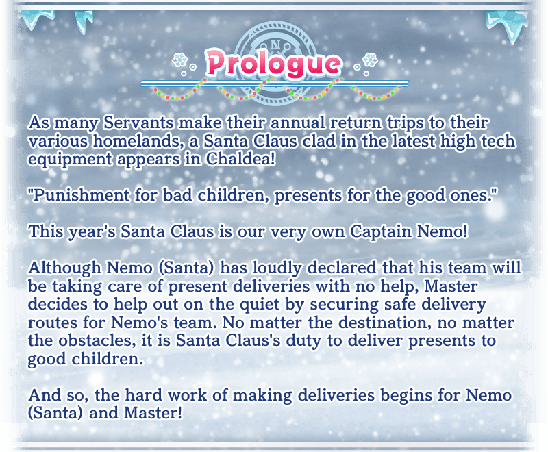 * The Mystic Code "White Christmas" will only appear in Event Item Exchange for Masters who have not fulfilled the requirements to play the event's Main Quests (clearing Part 2 Chapter 6.5 "Realm of the Thanatos Impulse, Traum - Life and Death of an Illusion"). * Ascension Materials and Spirit Origins for Noble Phantasm Enhancement for ★4 (SR) Nemo (Santa) will become available for exchange after clearing a certain Main Quest in the event. * Servant Coins for ★4 (SR) Nemo (Santa) will become available for exchange once he officially joins your roster. * The following items will disappear at the end of the exchange period: Nautilus Ornament, Shark Pie, Coral Cane, and Shell Cracker.