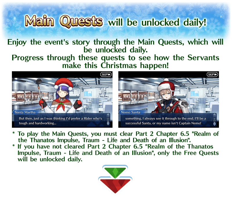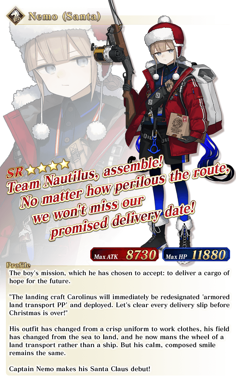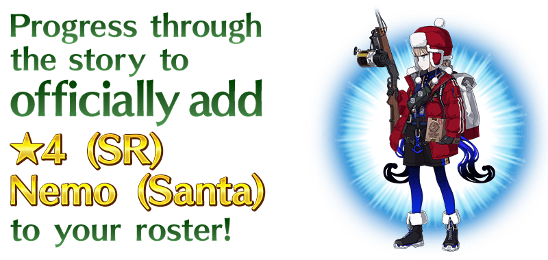 * To add ★4 (SR) Nemo (Santa) to your roster, you must clear Part 2 Chapter 6.5 "Realm of the Thanatos Impulse, Traum - Life and Death of an Illusion" and progress through the event's Main Quests.