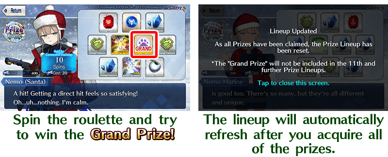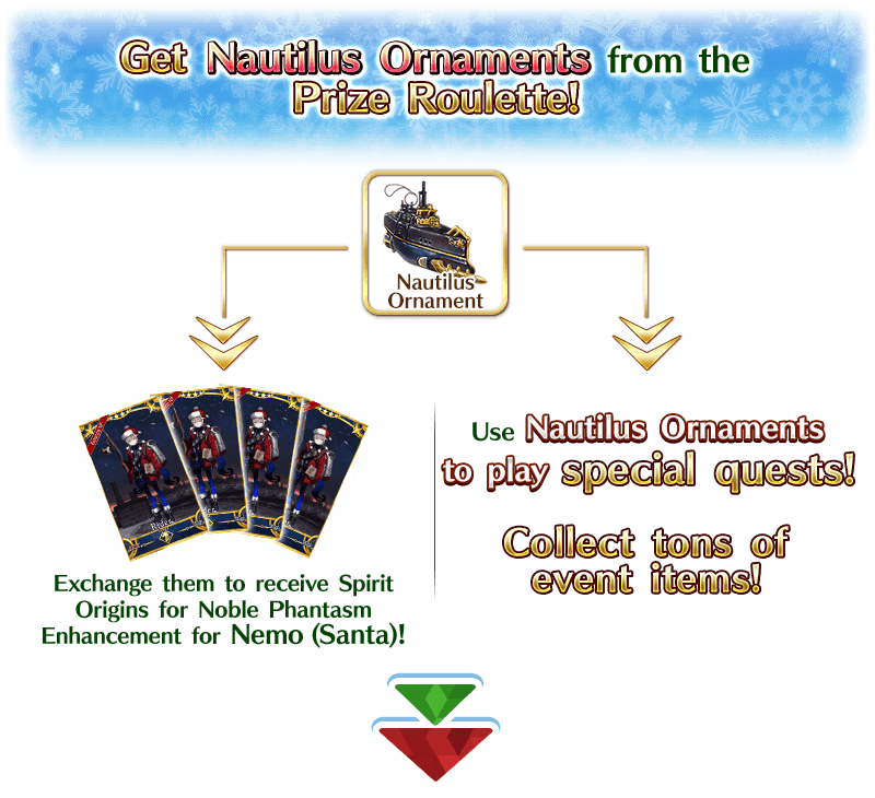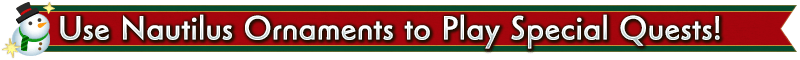 * For the first ten prize lineups, the "Prize Reset" button will appear once the Grand Prize has been claimed. * From the 11th prize lineup onward, the "Prize Reset" button will not appear. The lineup will be refreshed automatically once you have claimed all prizes. * Grand Prizes, Golden Fruit, and Silver Fruit will not be available in prize lineups from the 11th lineup onward. * Nautilus Ornaments, event items available in the Prize Roulette, can be used to play special quests. * All "Happy Christmas Tickets" will disappear at the end of the exchange period.