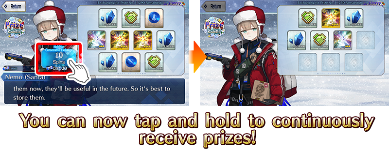 * When you use the consecutive prize exchange feature by tapping and holding, voice lines, etc., will be skipped. * If you obtain the Grand Prize or encounter a new message or voice line, this content will not be skipped.