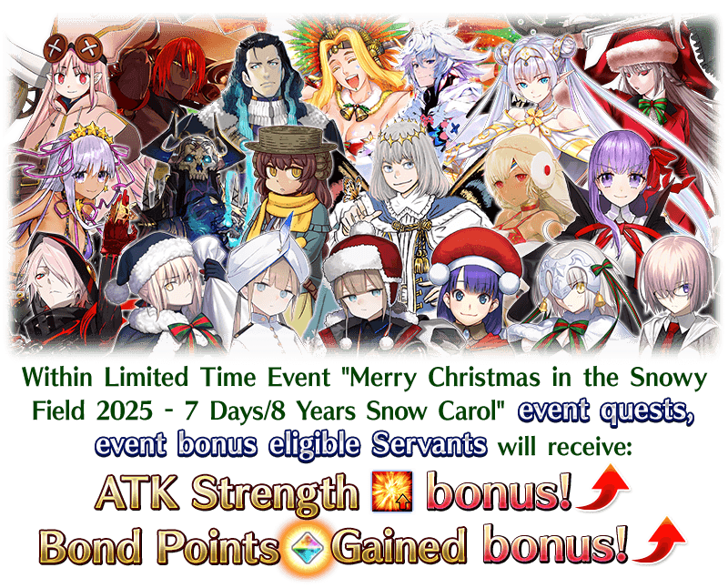 During the "Merry Christmas in the Snowy Field 2025 - 7 Days/8 Years Snow Carol", certain Servants will gain an ATK Strength bonus and a Bond Points Gained bonus within event quests!