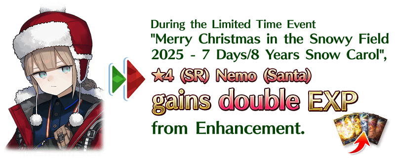 For the duration of the event period, ★4 (SR) Nemo (Santa) will receive double EXP when performing Enhancement.