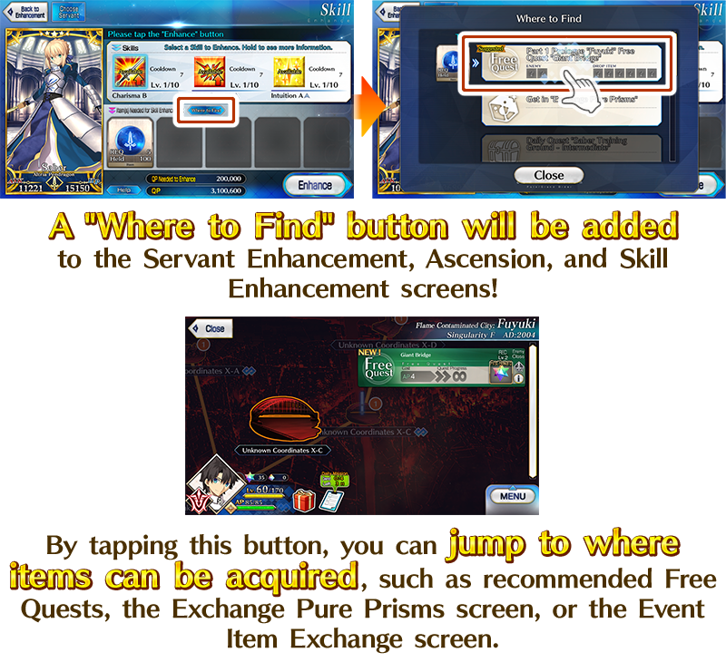 A "Where to Find" button has been added to the Servant Enhancement, Ascension, and Skill Enhancement screens. Tap the button to see the main locations the item in question can be acquired at.