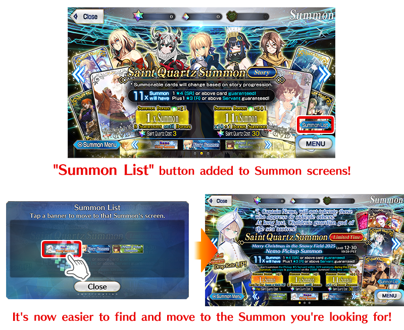 When you tap this button, a screen with a list of Summons will be displayed, where you can then tap each individual Summon banner to jump to its corresponding Summon screen.