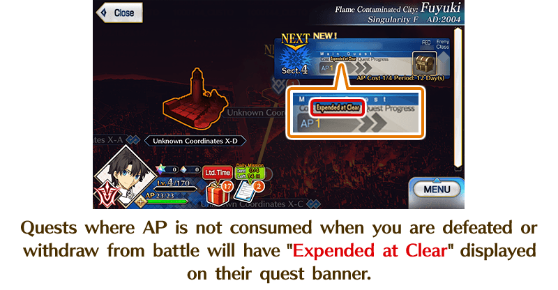 With this improvement, AP will not be consumed if you are defeated or withdraw from battle in quests that have "Expended at Clear" displayed on their quest banner.