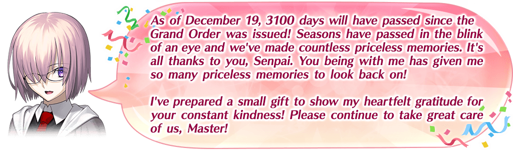 The presents will be sent to your Present Box on the first login between 2025-12-19 20:00 - 12-20 19:59 PST (GMT -8).