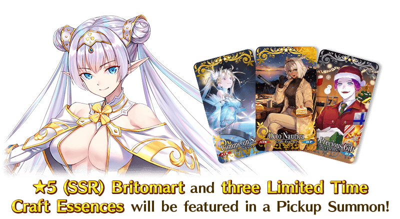 To go along with the Limited Time Event "Merry Christmas in the Snowy Field 2025 - 7 Days/8 Years Snow Carol", ★5 (SSR) Britomart and three Limited Time Craft Essences will be available for Pickup! * All Masters will be able to participate in the "Merry Christmas in the Snowy Field 2025 Britomart Pickup Summon", regardless of story progression.