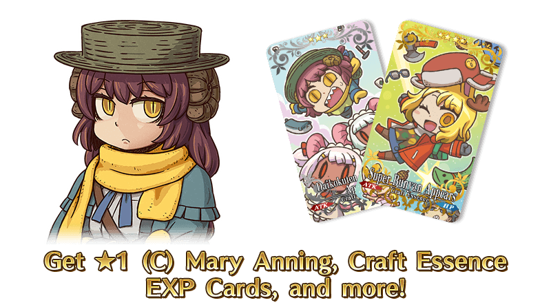 For a limited time ★1 (C) Mary Anning, along with CE EXP Cards "★4 (SR) Super Bunyan Appears" and "★3 (R) Daikokuten & Anning Appear", will be summonable from Friend Point Summon!