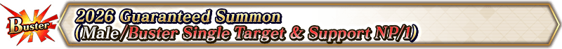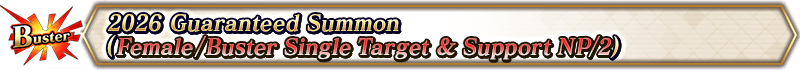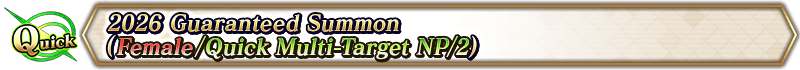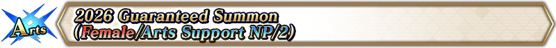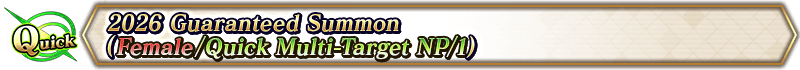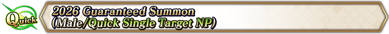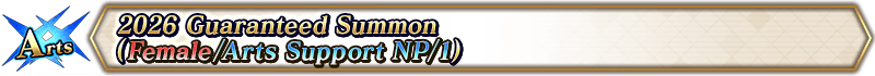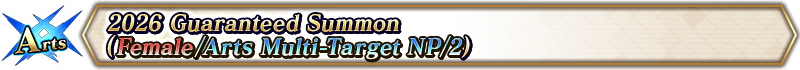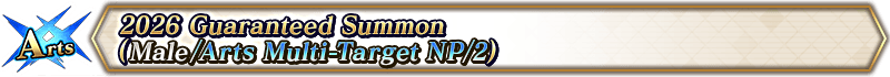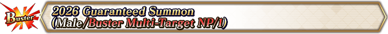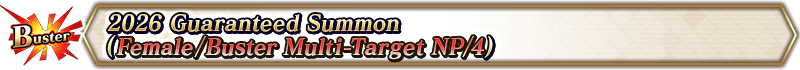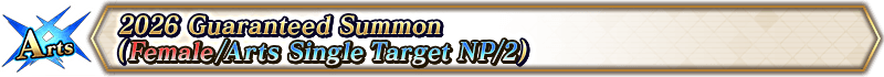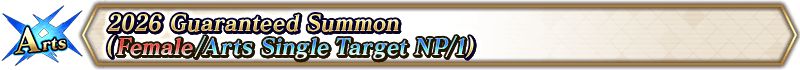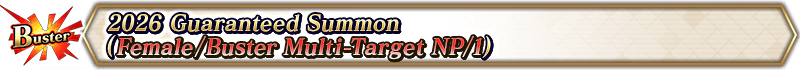 About Featured Servants: * For the "New Year's 2026 Guaranteed Summon (Gender/NP Type & Effect Specific)", the only Servants summonable will be those that are listed for each individual Summon. * Servants whose gender is not listed as "Male" or "Female" will be summonable from both Male and Female Guaranteed Summons of the applicable Noble Phantasm type and Noble Phantasm effect. Furthermore, ★5 (SSR) Okita Souji Alter (Saber) will only be summonable from the "2026 Guaranteed Summon (Female/Quick Multi-Target NP/1)", and ★5 (SSR) Demon King Nobunaga (Oda Nobunaga) will only be summonable from the "2026 Guaranteed Summon (Female/Buster Multi-Target NP/2)". * The following Servant(s) will not be summonable from the "New Year's 2026 Guaranteed Summon (Gender/NP Type & Effect Specific)". - ★5 (SSR) Yamato Takeru - ★5 (SSR) Sodom's Beast/Draco * Please note that the Stage 3 Ascensions for ★5 (SSR) Mélusine (Lancer) (Tam Lin Lancelot), ★4 (SR) Barghest (Tam Lin Gawain), and ★4 (SR) Baobhan Sith (Tam Lin Tristan) contain spoilers for "Lostbelt No.6: Fae Round Table Domain, Avalon le Fae - The Moment a Planet Is Born". * Story Summon Servants of rarity ★4 (SR) and lower will be summonable, even if they have not yet been added to Story Summon through story progression, if they are listed for an individual Summon. * The name displayed for Servants whose True Names are hidden will change based on story progression. In some cases, the name displayed for their Noble Phantasm will also change.