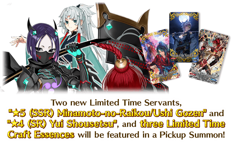 To commemorate the Limited Time "Fate/Samurai Remnant × Fate/Grand Order Collaboration Event - Waxing Moon Chronicles", two new Limited Time Servants, "★5 (SSR) Minamoto-no-Raikou/Ushi Gozen" and "★4 (SR) Yui Shousetsu", and three Limited Time Craft Essences will be featured in a Pickup Summon!