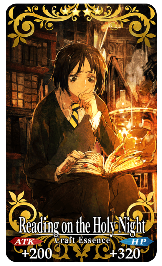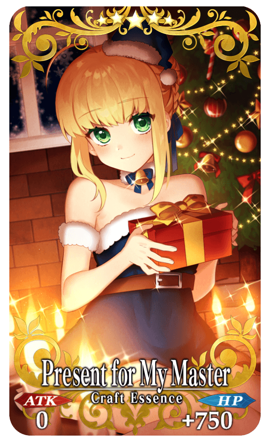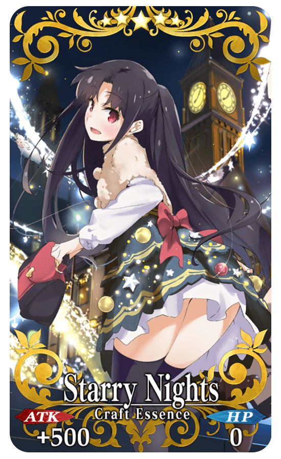 About Featured Craft Essences: * The following Limited Time Craft Essence(s) will only be summonable from the Summon Lineup(s) where they are featured as Pickup Craft Essences. Please be sure to confirm the lineup before summoning. - ★5 (SSR) Present for My Master - ★5 (SSR) A Moment of Tranquility - ★5 (SSR) Starry Nights - ★5 (SSR) Twinkling Stars - ★4 (SR) March of the Saint - ★4 (SR) Reading on the Holy Night - ★4 (SR) Party Time - ★4 (SR) Red Box - ★3 (R) Lightning Reindeer - ★3 (R) Saint's Invitation - ★3 (R) Snow Pirates - ★3 (R) Freeze Frame * The following Craft Essence(s) will also be available from Friend Point Summon only for the duration of the Pickup Summon(s) where they are featured as a Pickup Craft Essence. In addition, the Craft Essence(s) will be automatically burned if you have ★3 (R) Craft Essences included in your Automatic Burning settings. Please check your settings before summoning. - ★3 (R) Lightning Reindeer - ★3 (R) Saint's Invitation - ★3 (R) Snow Pirates - ★3 (R) Freeze Frame