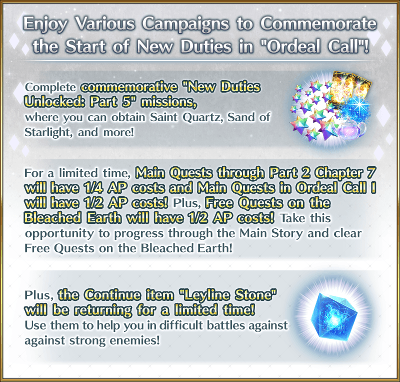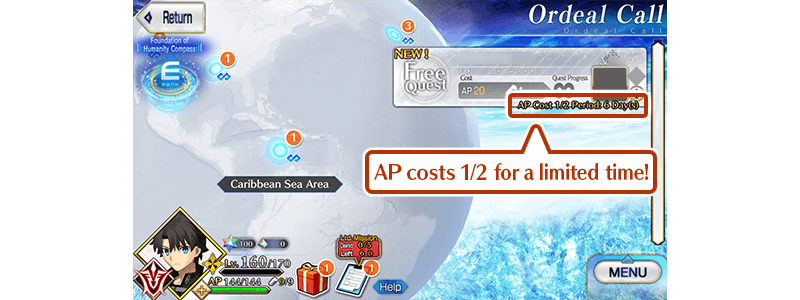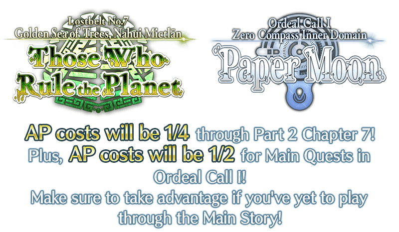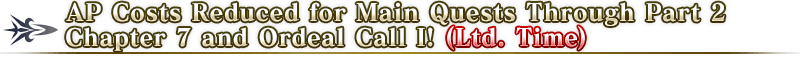 During the period below, Main Quests in Part 1 and Part 2 through Chapter 7 will have AP costs reduced to 1/4 and Ordeal Call I will have AP costs reduced to 1/2! (AP costs will be reduced even if you withdraw from battle)