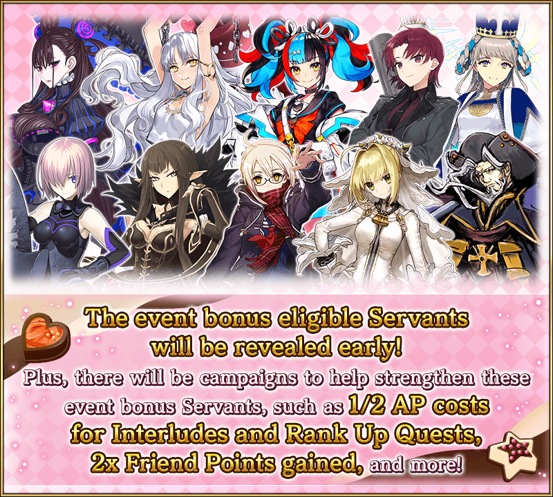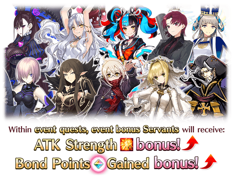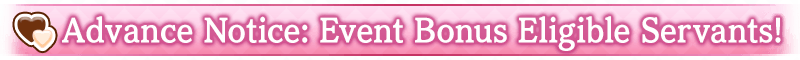 During the Limited Time Event "Valentine's 2026", certain Servants will gain an ATK Strength bonus and a Bond Points Gained bonus within event quests!
