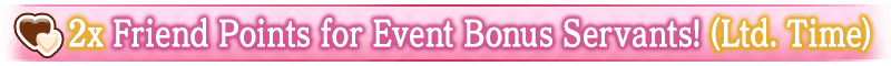 During the period listed below, eligible Servants will award double Friend Points when you choose them as a Support in battles and when other Masters use them from your Support Lineup.