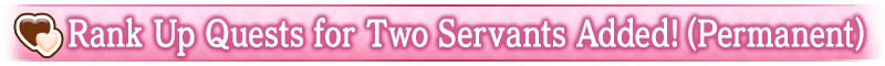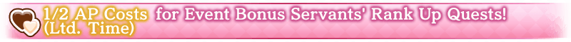 During the period listed below, Rank Up Quests for event bonus Servants will have their AP costs halved! (AP costs will be halved even if you withdraw from battle)