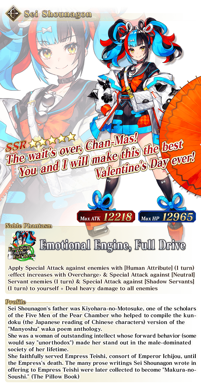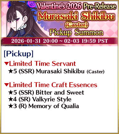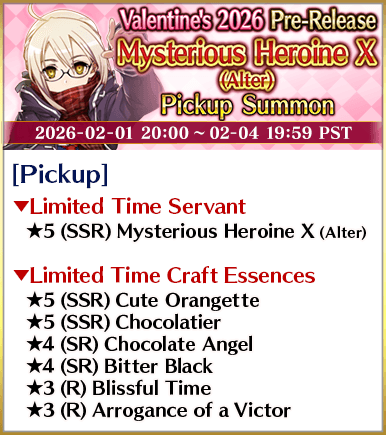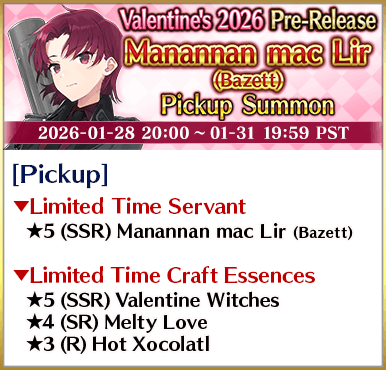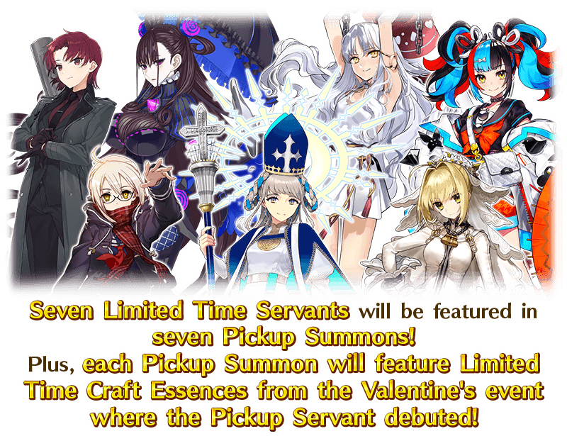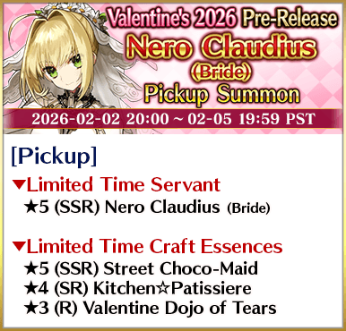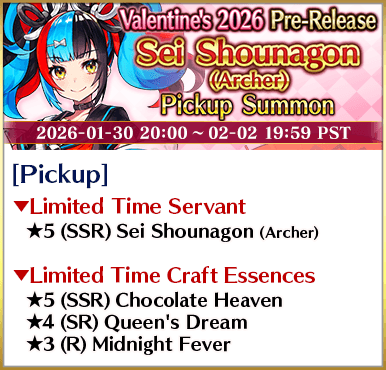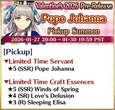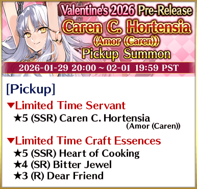 To commemorate the "Valentine's 2026 Pre-Release Campaign", seven Limited Time Servants related to Valentine's events and 24 Limited Time Craft Essences from previous Valentine's events will be featured in seven Pickup Summons!