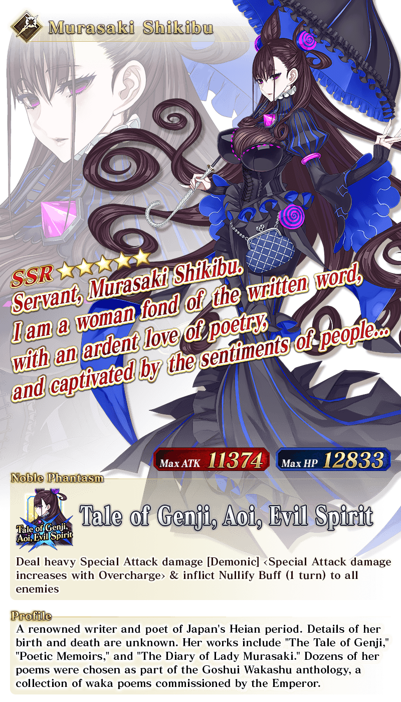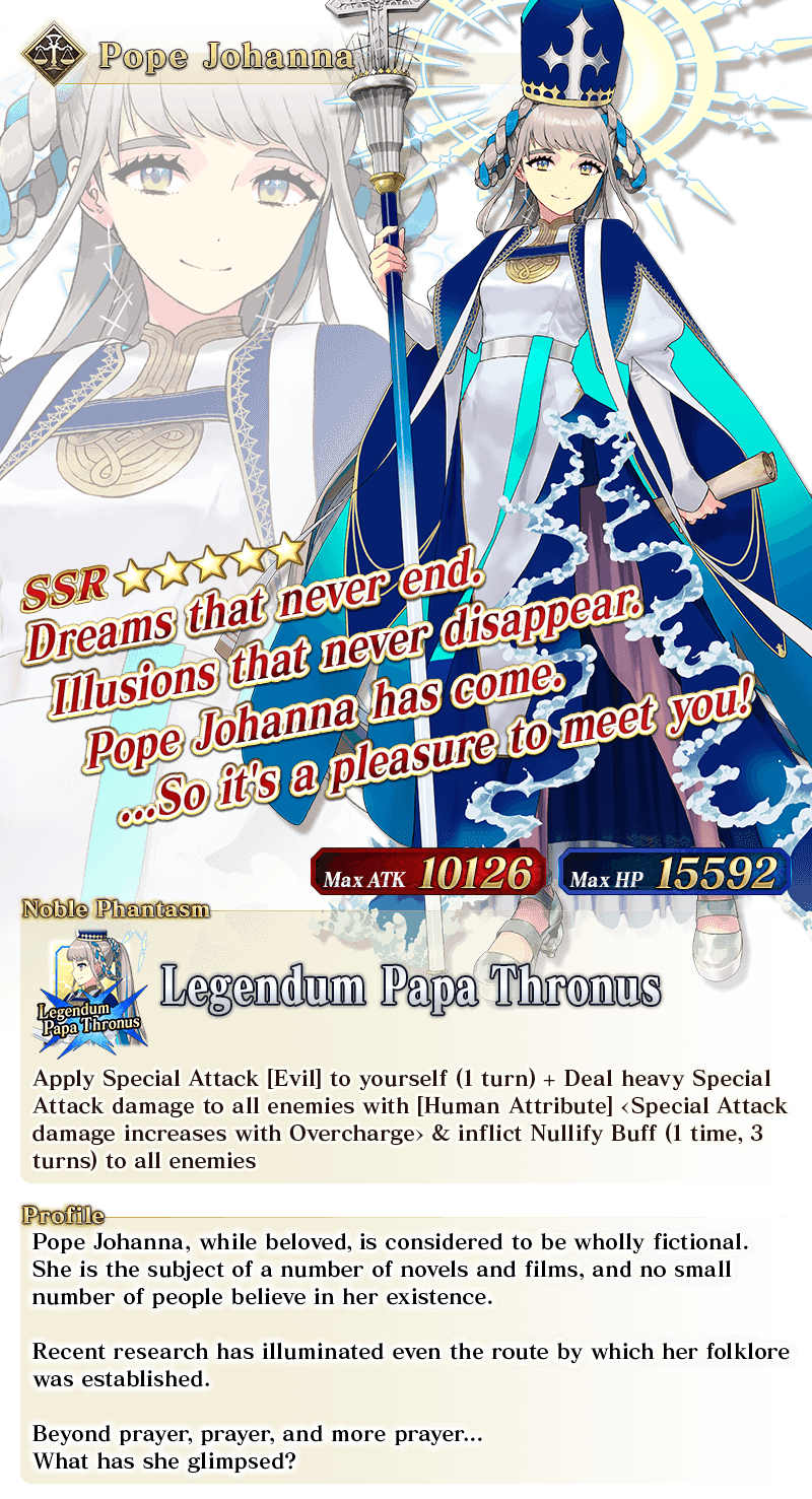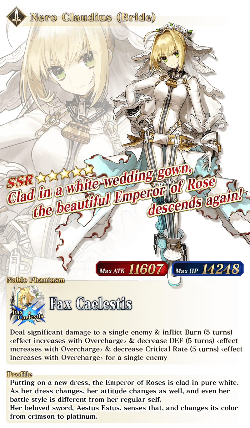 About Featured Servants: * The name displayed on ★5 (SSR) Amor (Caren)'s Saint Graph will change to "★5 (SSR) Caren C. Hortensia" with Ascension. * The following Limited Time Servant(s) will only be summonable from the Summon Lineup(s) where they are featured as a Pickup Servant. In addition, they will not be added to Story Summon after the Pickup Summon period ends. - ★5 (SSR) Nero Claudius (Bride) - ★5 (SSR) Sei Shounagon (Archer) - ★5 (SSR) Murasaki Shikibu (Caster) - ★5 (SSR) Mysterious Heroine X (Alter) - ★5 (SSR) Caren C. Hortensia (Amor (Caren)) - ★5 (SSR) Pope Johanna - ★5 (SSR) Manannan mac Lir (Bazett) * Servants added to Story Summon through story progression will not be summonable. Please be sure to confirm the lineup before summoning.