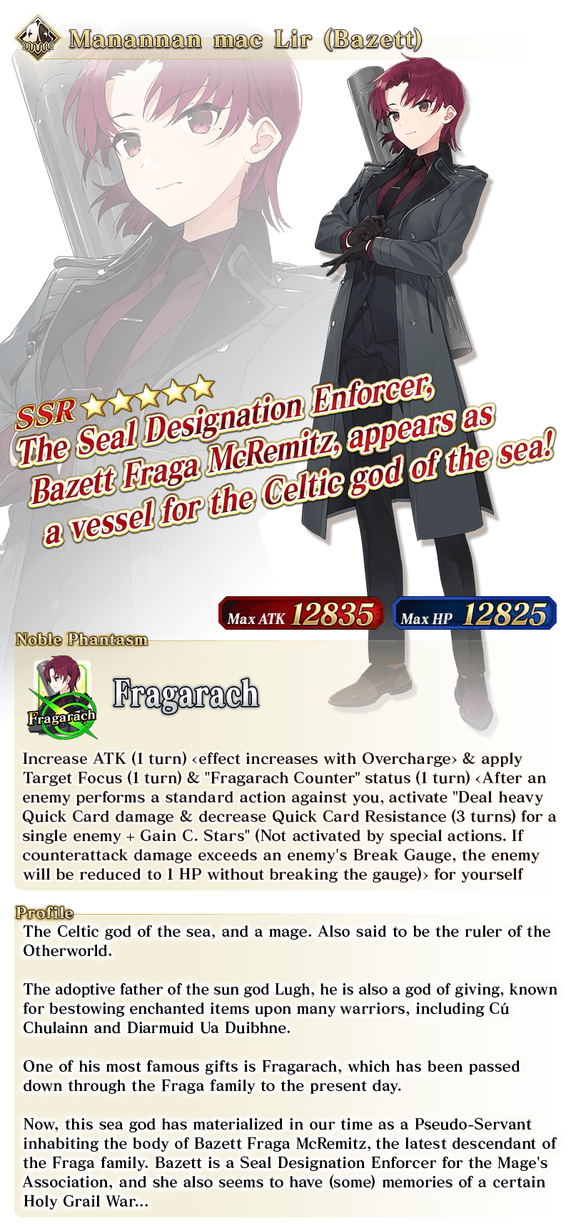 * The name displayed for ★5 (SSR) Manannan mac Lir (Bazett)'s Noble Phantasm will change based on Ascension stage.