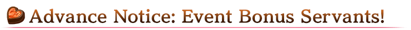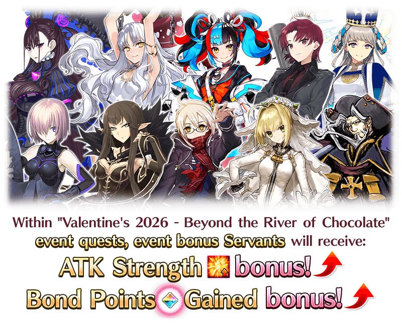 For the duration of the upcoming "Valentine's 2026 - Beyond the River of Chocolate" event period, certain Servants will receive an ATK Strength bonus and a Bond Points Gained bonus within event quests!
